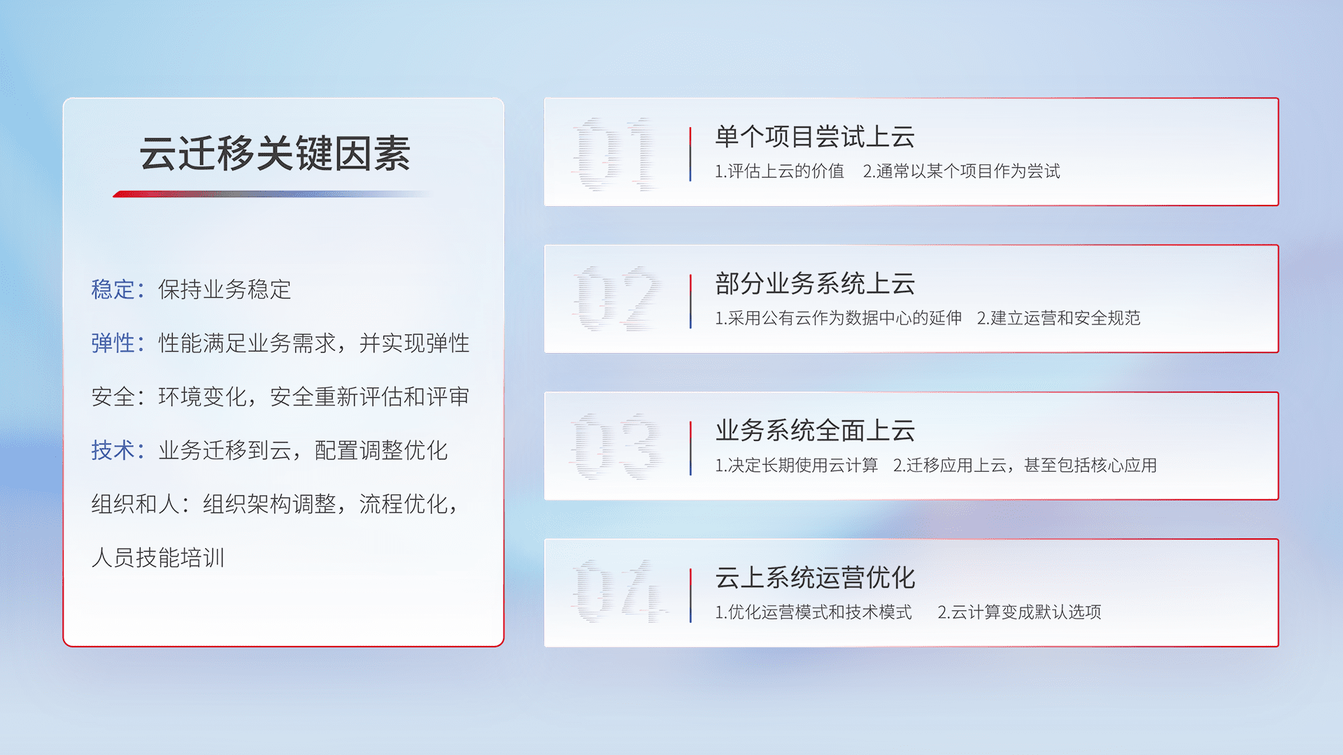 结合实际业务,,,从规划设计、、、、云平台选型、、、、云原生改造、、、、数据迁移、、、集成交付,,,迁移全过程为客户识别最佳上云路径,,,做好风险识别管理,,,,设计网络架构、、、身份权限、、安全审计合规、、、操作审计、、、日志审计、、、监控告警策略、、、多站点容灾设计等,,对云上基础设施进行整体规划,,提升IT治理水平,,,,以满足弹性、、高可用、、高性能的需求。。