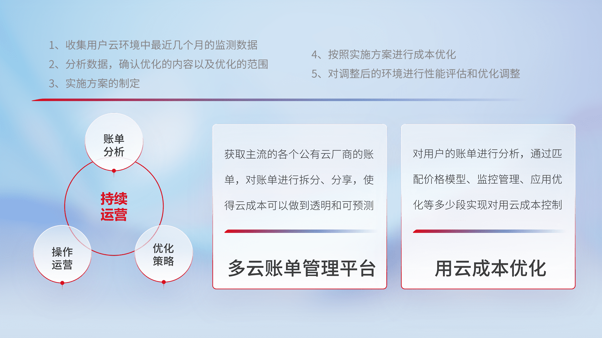 通过多云纳管,,以统一的资源数据模型把客户的云资源进行抽象和封装,,,进而实现对多云资源的统一操作,,保障云资源管理的可靠性、、、、稳定性与可用性。。。。量身定制化运维内容,,,配置、、开发运维、、、补丁管理、、、、备份、、、、监控、、、认证和访问管理、、审计和日常巡检等,,,,保障在用云过程中的可靠度,,,,稳定度以及高可用率。。