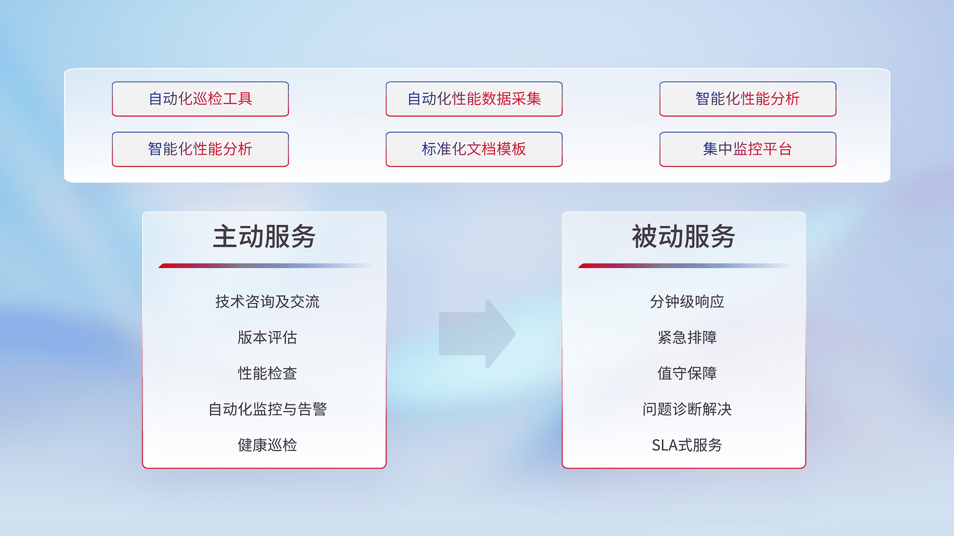 智能化工具和标准化文档,,保障服务质量,,提供主动服务(包含技术咨询、、、版本评估、、、性能检查、、、、自动化监控与告警、、、健康巡检)和被动服务包含(分钟级响应、、、、紧急排障、、、、值守保障、、问题诊断解决、、SLA服务)。。